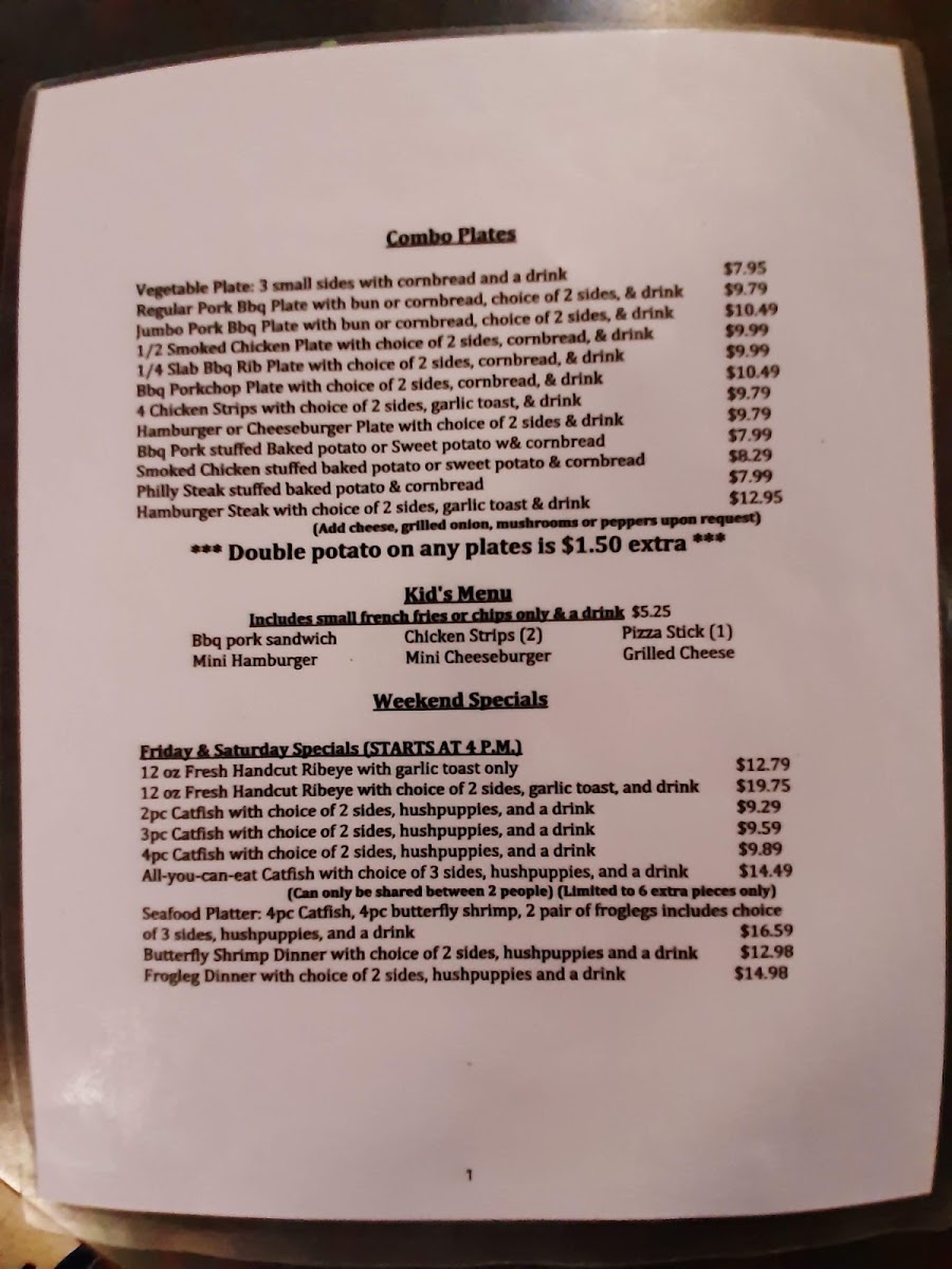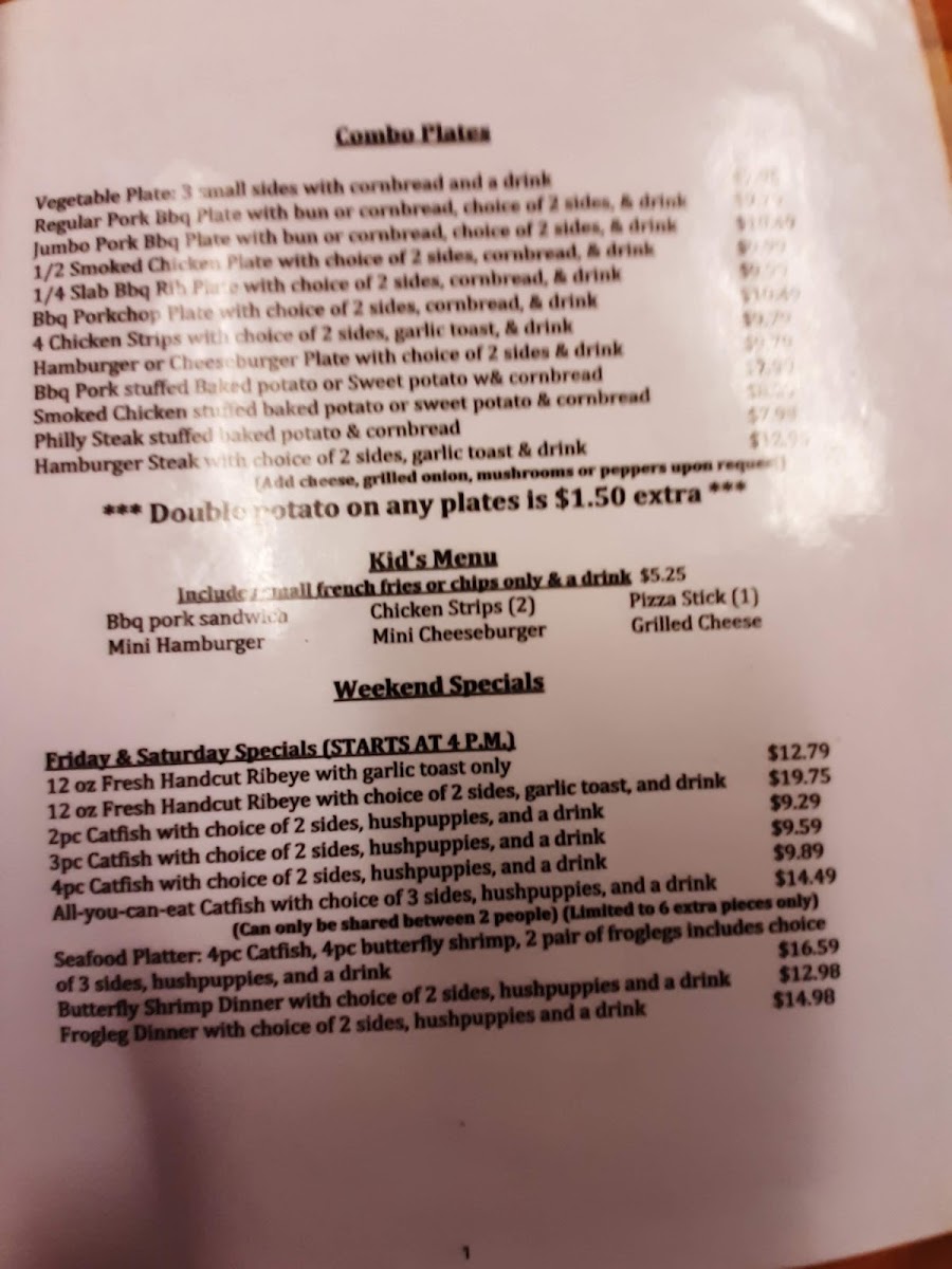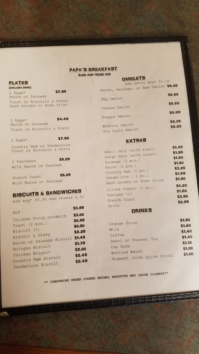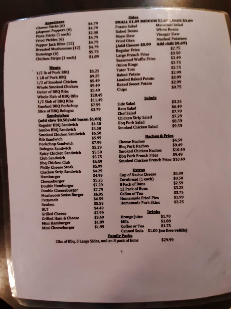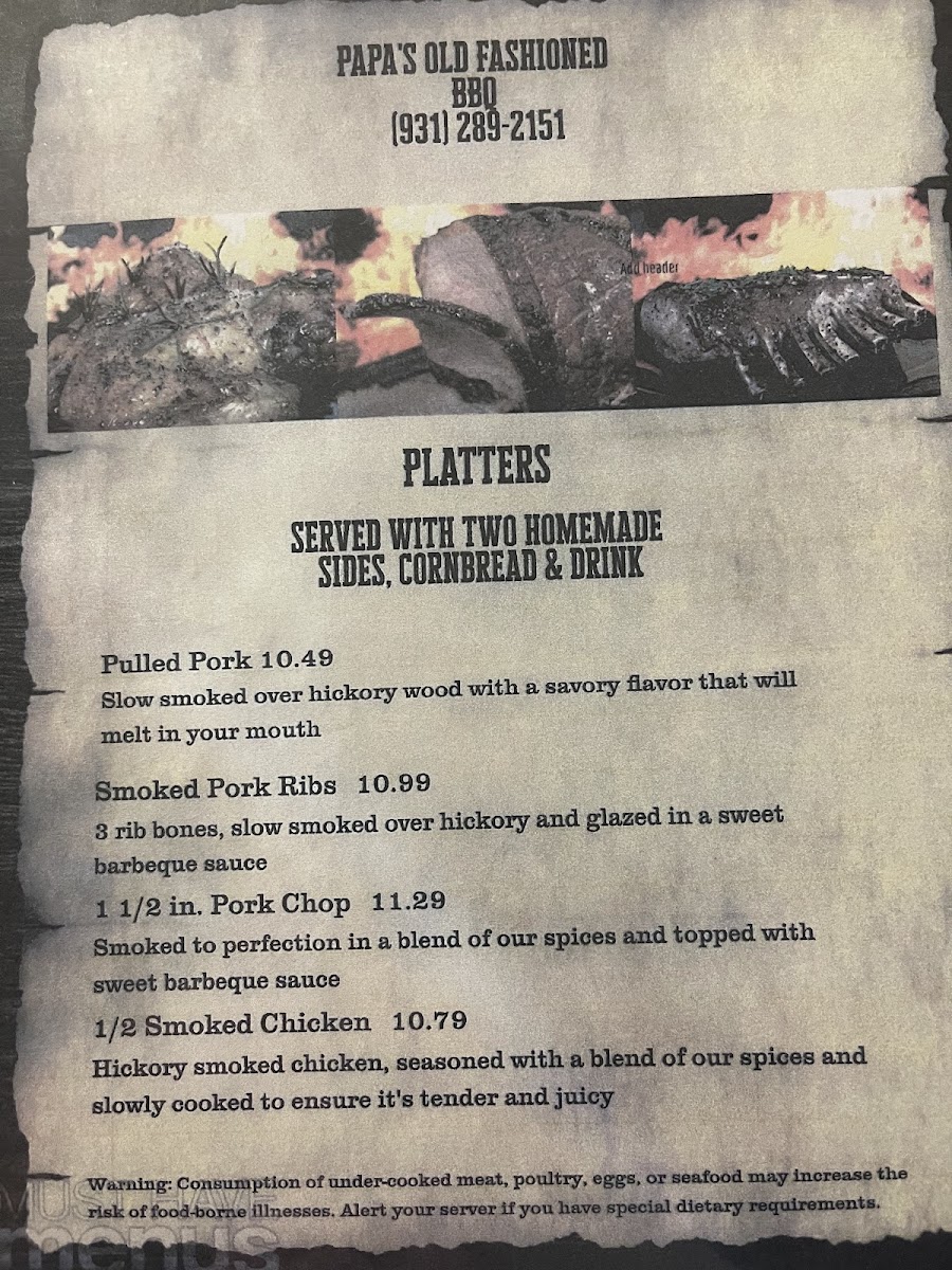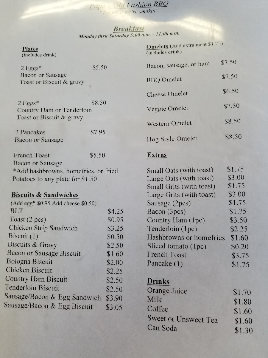 Papa's Old Fashion BBQ offers a straightforward, comforting menu centered on classic Southern barbecue and homestyle dishes. The menu is designed for casual dining, whether you're stopping by for a quick lunch, picking up a hearty breakfast to go, or enjoying a relaxed dinner with family or friends.